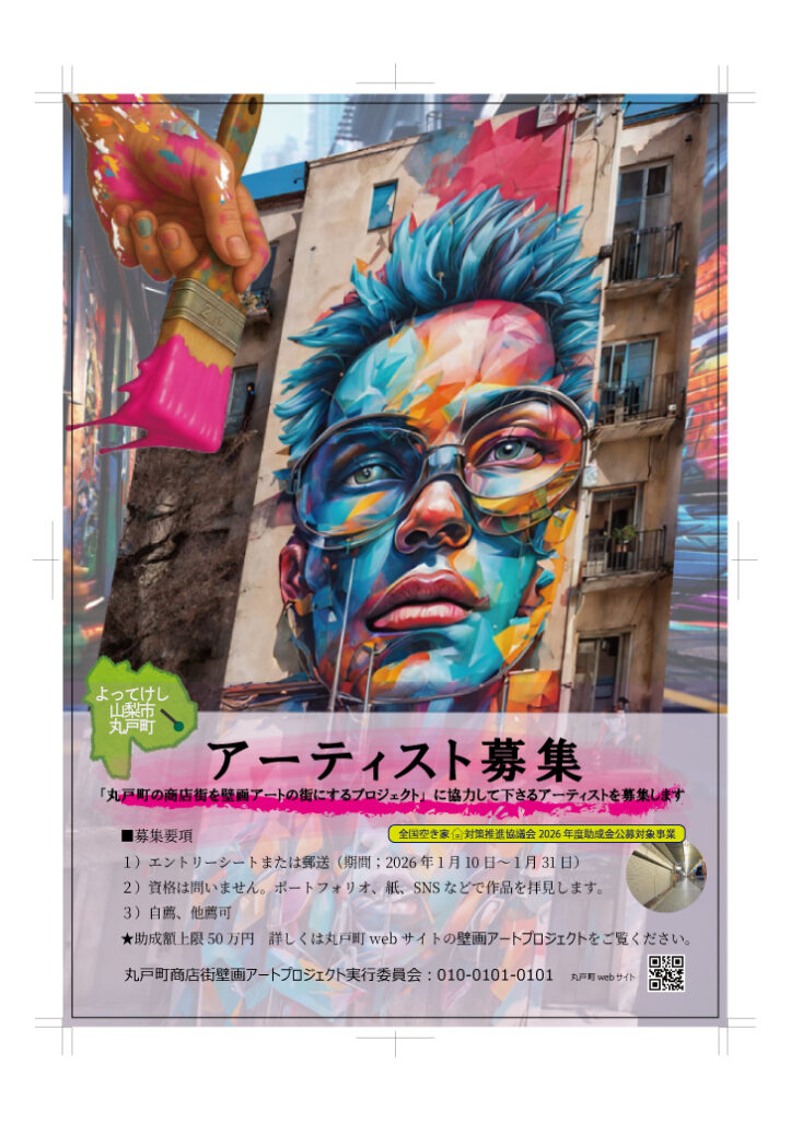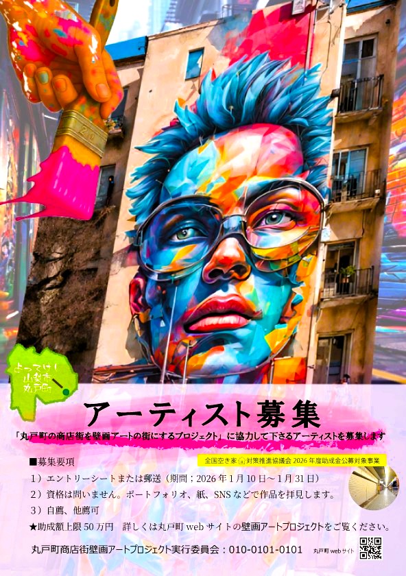 荒廃したエリアの再生の為につながる壁画アートのイメージで何か作りたかた。無料で写真を提供している美術教師の方のサイトの子の絵が気に入り、すぐに、「田舎のシャッター外でアーティスト募集しようとコンセプトが決まりました。