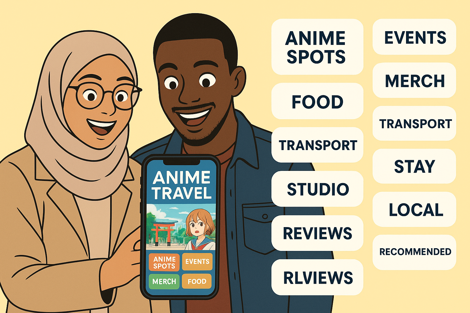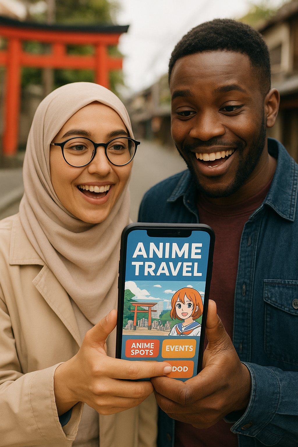 ありがとう。これはこれでとっておきます。 別のイメージでもう一つ作ってください。 ヒジャブを被った眼鏡の女性とブラックの男性2人のカップルが、ワクワクと楽しそうな表情をしながら、スマホをもってアニメの聖地をめぐる旅をしているという、というイメージの写真を作ってください。 スマホで当アニメ情報サイトを開いて見ています。 そのスマホをクローズアップして、こんな情報が見れるよ、という風な写実的なデザインを作って下さい。