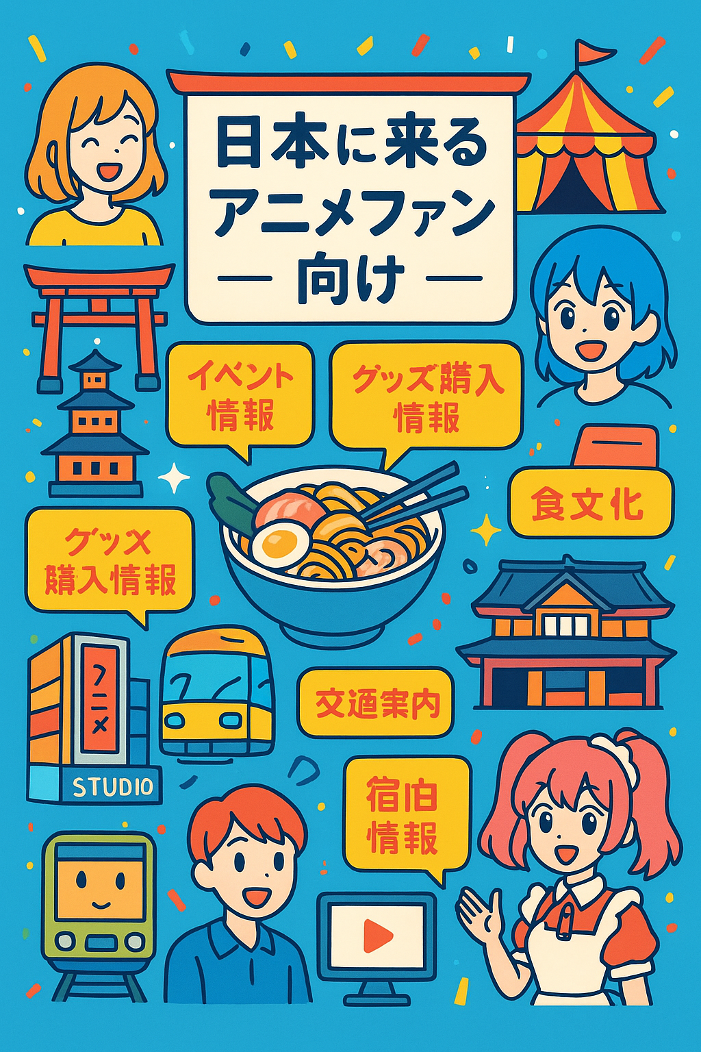 日本に来るアニメファン向けのwebサイトのデザインカンプを作ってほしいです。まずは表紙を作ってほしいです。 カラフルでポップ、キャッチーなイラスト画像で作ってください。 カテゴリ内容は、以下です。 アニメ関連スポット;人気のアニメ聖地やスタジオ(例:秋葉原、池袋、スタジオジブリなど) イベント情報;アニメ関連のイベントやフェスティバルのスケジュール、参加方法 グッズ購入情報;おすすめのショップやネット通販、限定商品情報 食文化;アニメに登場する料理やキャラクターをテーマにしたカフェの紹介 交通案内;アニメスポットへのアクセス方法、ICカードの利用方法 アニメをテーマにした宿泊施設やコスプレ可能なホテルの情報、 地元アニメ制作の紹介、地元のアニメ制作会社の紹介や見学ツアー情報、インタビューやレビュー アニメファンや観光客の体験談、レビュー記事、 SNS連携、ファン同士の交流を促すためのフォーラムやSNS連携の紹介、 おすすめのアニメ作品、日本で観るべきアニメのリストや評価、視聴するためのプラットフォーム情報 これらの情報を盛り込みたいです。 画像生成をお願いします。
