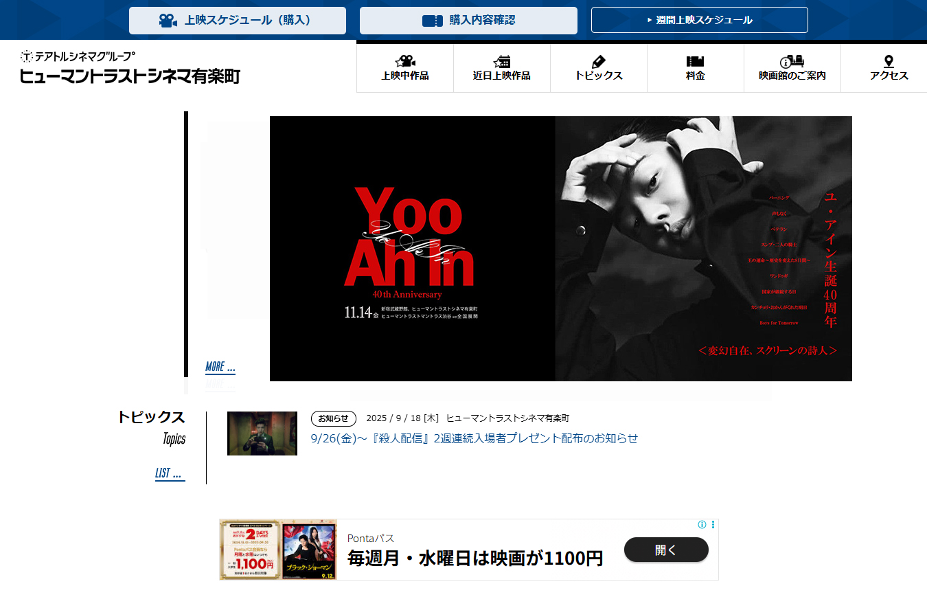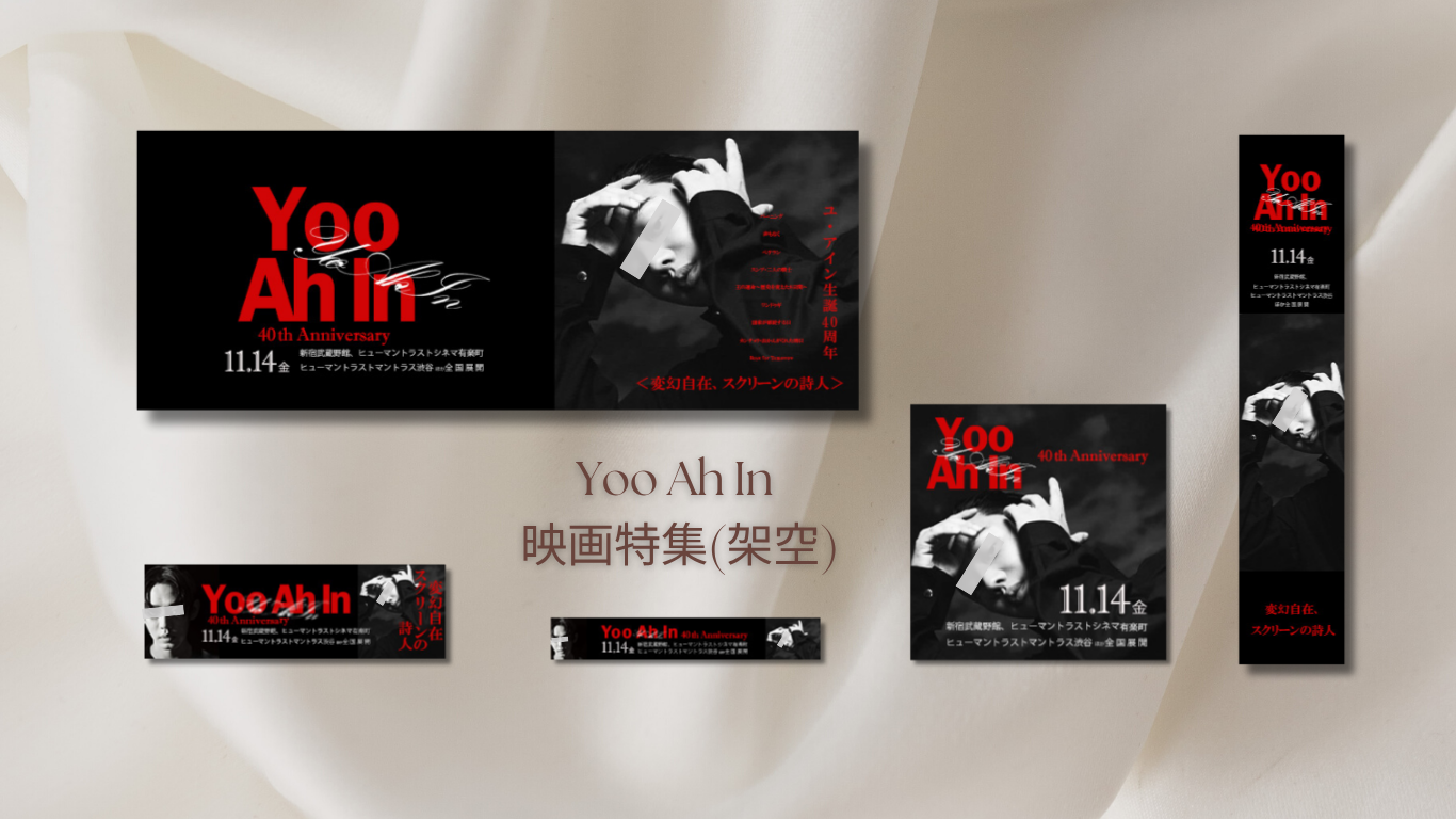 俳優の「映画特集」のバナーをサイズ違いで制作。配信全盛の時代ですが、自分がある映画特集に目が留まったことから、あえて映画館題材を取り上げてみました。スタイリッシュで目を引くデザインの模倣をしながらインパクトのある内容を心掛けました。